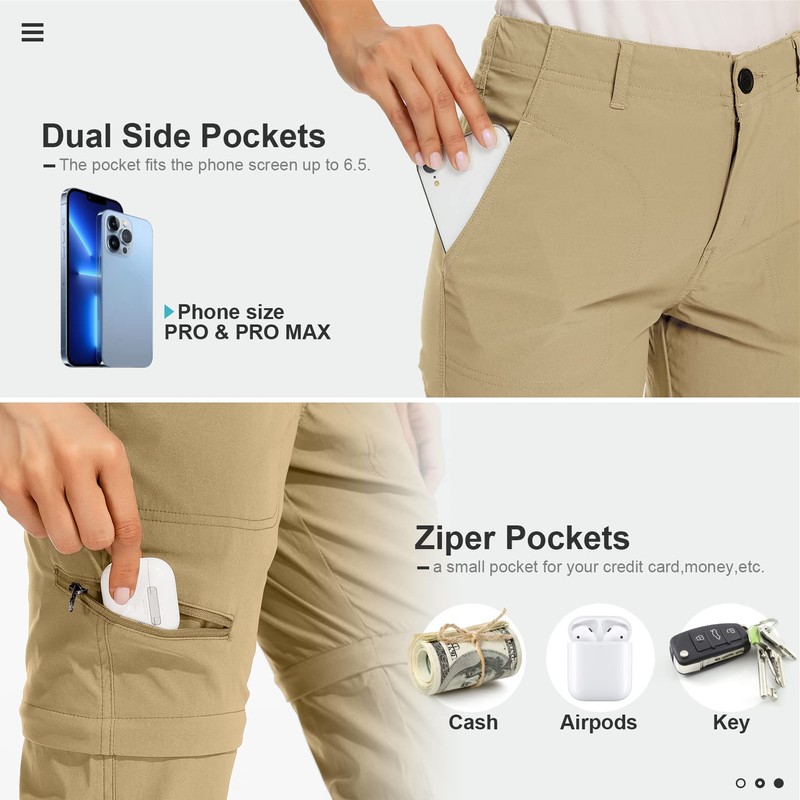 - Cargo summer pants women:Deep enough to securely hold your 5.5¡± phones, wallets and keys, ect., and Nylon zippers promise extra smoothly and durability hiking pants, Two-section detachable hiking pants, made from a zipper on the knee, directly removed the pants to become a shorts style, especially suitable for the Summer spring and autumn seasons.