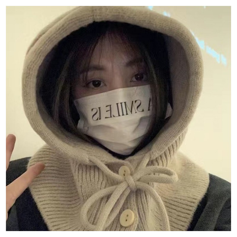 Women's Knitted Balaclava Hat & Winter Scarf One-Piece LF1329 One Size / Thick Beige 4ea