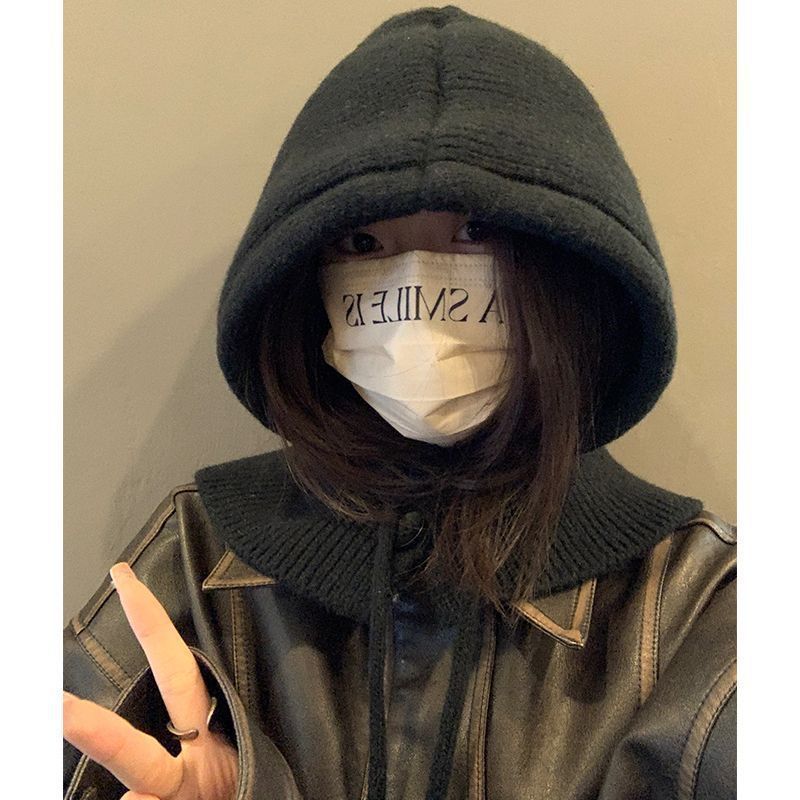Women's Knitted Balaclava Hat & Winter Scarf One-Piece LF1329 One Size / Thick Black 4ea