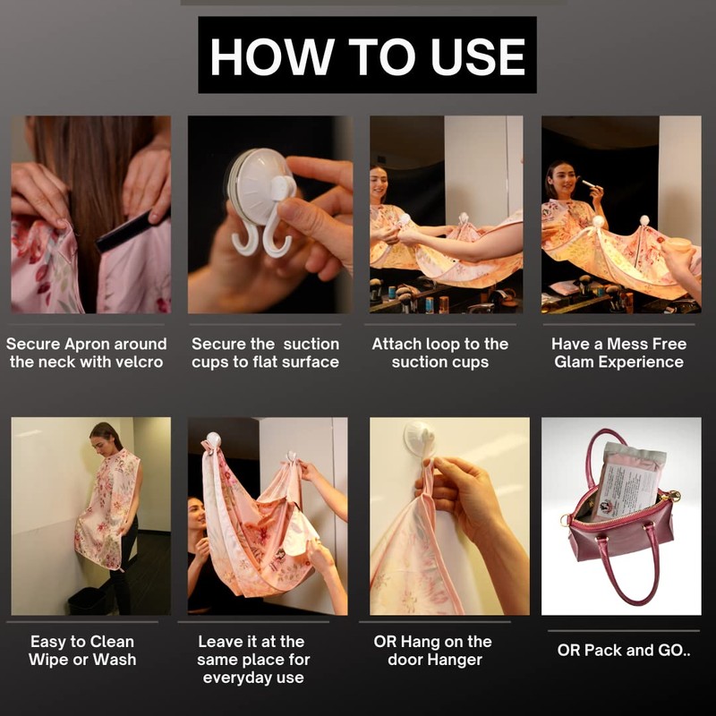 - ✅ EVERY GIRL NEEDS ONE – This makeup Catcher Apron Kit supplied with strong suction cups which stick to all flat surfaces: mirrors, flat and smooth makeup table comes with 2 Strong Suction cups, makeup catcher Apron, Instruction card and packed in a light bag. Ideal for travel and perfect for on the go