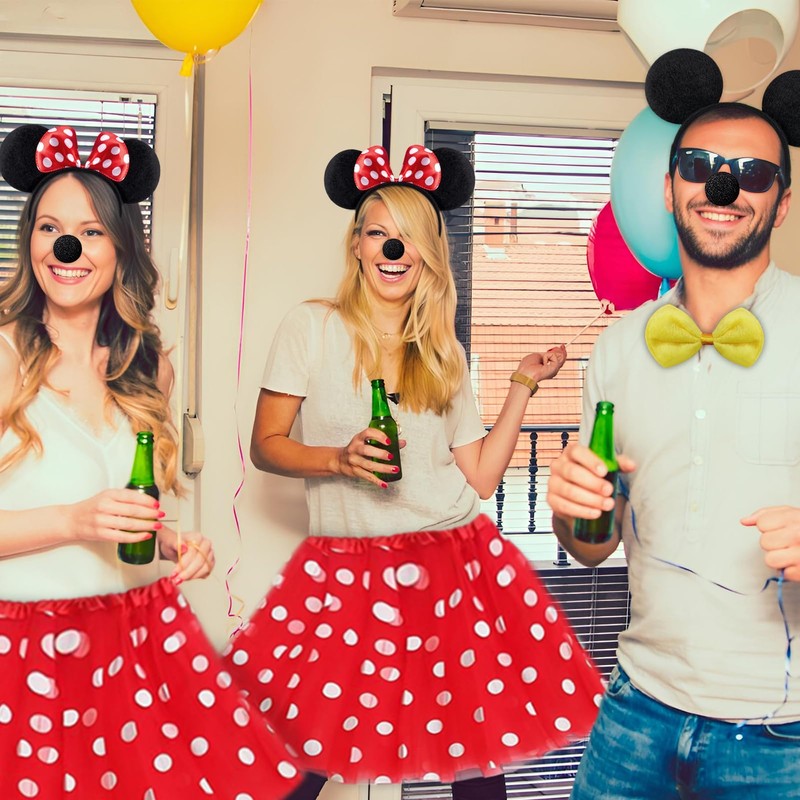 - Minnie Mouse costume women: 1 x red tutu with white dots, 2 x mouse ear headband, 1 x men's bow tie, 1 x women's belt, 1 x tail, 4 x gloves, 2 x nose. Complete women's mouse costume accessory makes you an enchanting centre of attention at carnival.