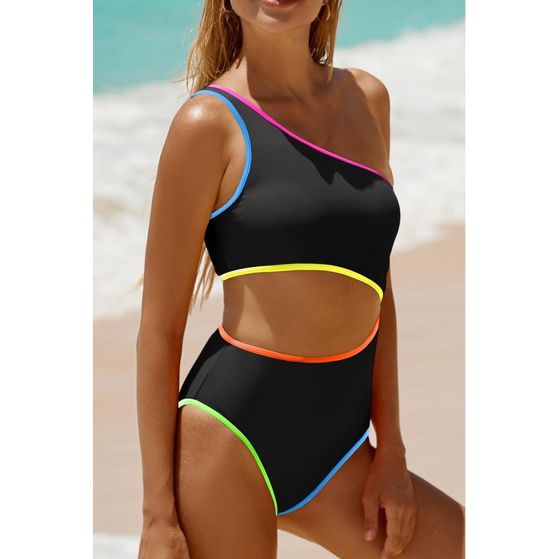 Women's One Piece Swimsuit- One Shoulder Bathing Suit Cutout Tummy Control Swimwear Colorblock Black L