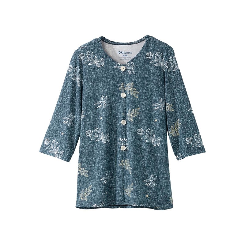No Peek: Full back coverage for complete dignity, with 2 overlapping back panels Reduces Exposure - Overlapping panels maintains coverage better than standard open back styles Quick Struggle-Free Dressing - Reduces dressing time Easy Access Dressing: Terrific for lowered arm mobility Decorative Buttons: Cute, non-functional buttons for added style Center Back Length: 26 inches Fabric Description: Our signature milk silk fabric has a brushed finish for a luxe buttery soft feel. Pair that with high stretch, and wearers will never want to wear anything else. Fabric Weight: Medium weight, making it versatile for both summer and winter. The Senior Women's Open Back Faux Button Up Top is an ideal women's assisted dressing top. This adaptive top for women features a discreet and generous back overlap for additional coverage for caregivers to easily secure this garment. This top also features a buttery soft printed fabric and decorative, non-functioning buttons on the front for a traditional, stylish look!