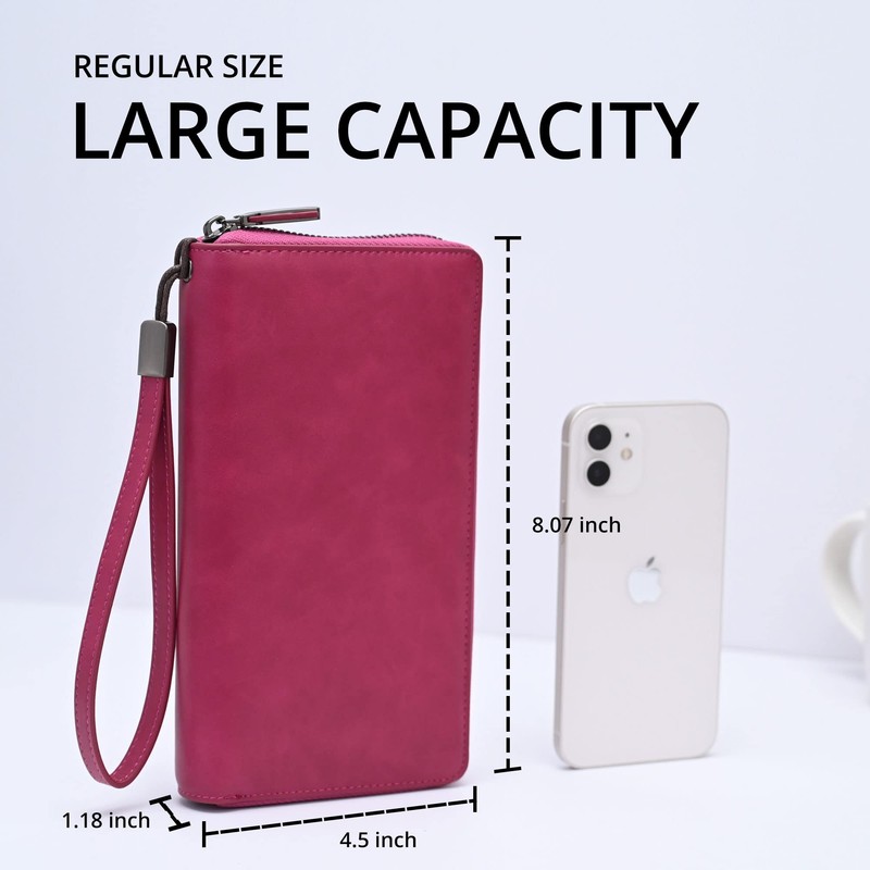 Women's RFID Blocking Leather Zip Around Wallet Large Phone Holder Clutch Travel Purse Wristlet (Fuchsia Purple)