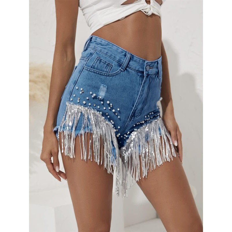 Women's Rhinestone Pearls Tassels Raw Hem Shorts Frayed Ripped Hot Denim Jean Shorts Navy Blue
