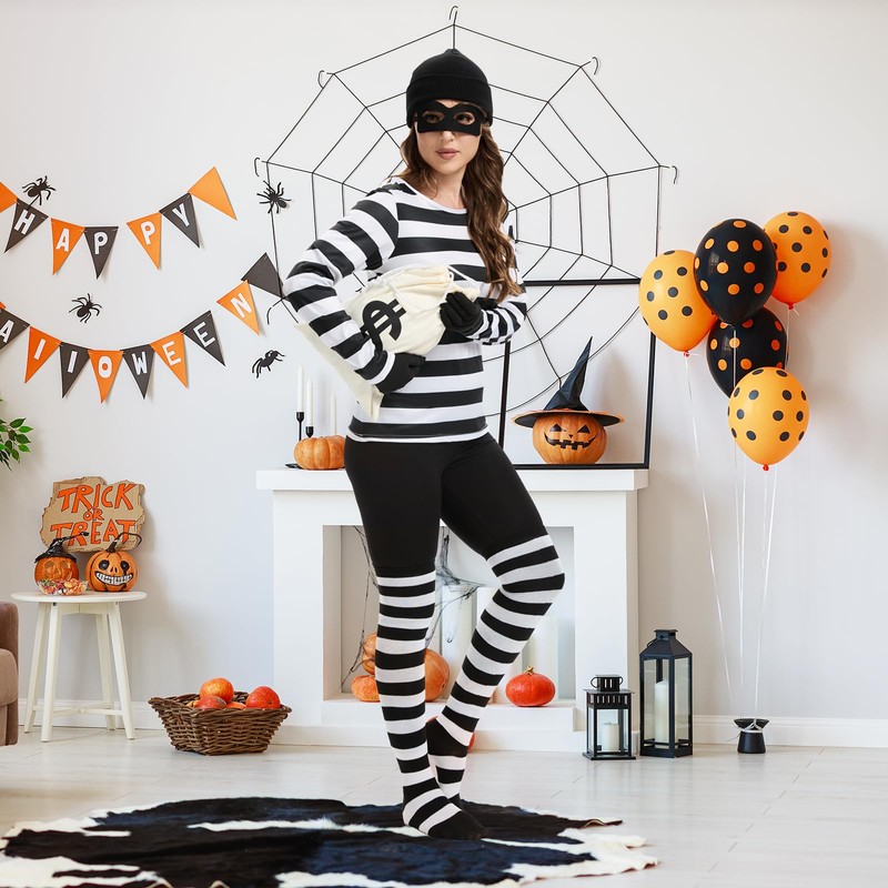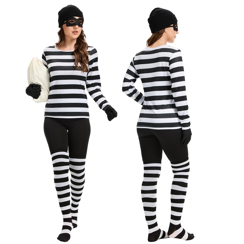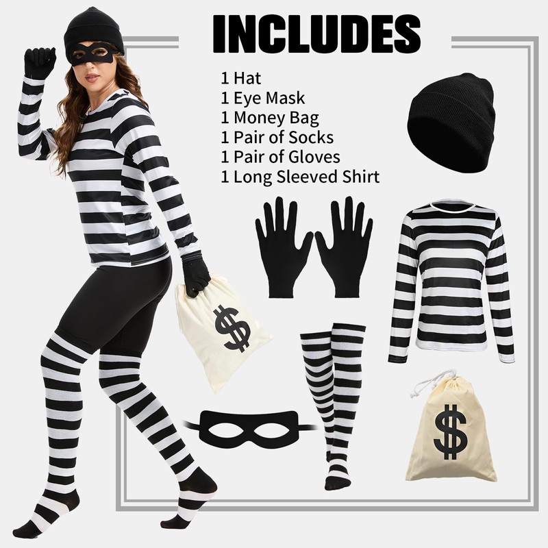 - Women Robber Costume includes: 1 Pcs striped long-sleeved shirt,1 Pcs socks, 1 Pcs black eye mask, 1 Pcs beanie hat, 1 Pcs black gloves and 1 Pcs Drawstring canvas purse.