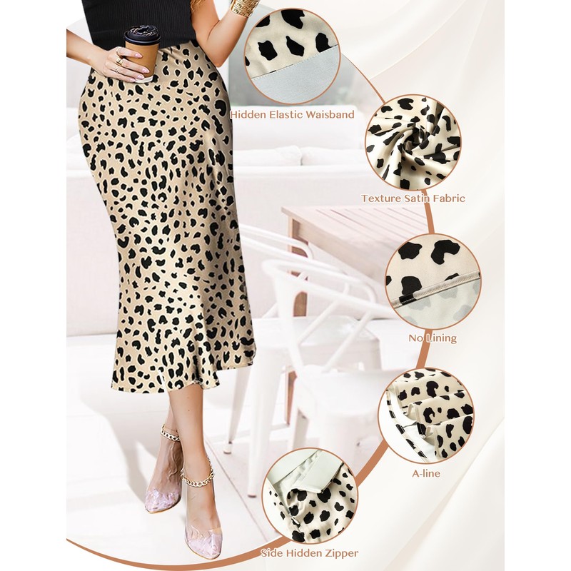 Women's Skirt, Midi Satin High Waist Skirt (US, Alpha, Medium, Regular, Regular, Standard, Leopard)