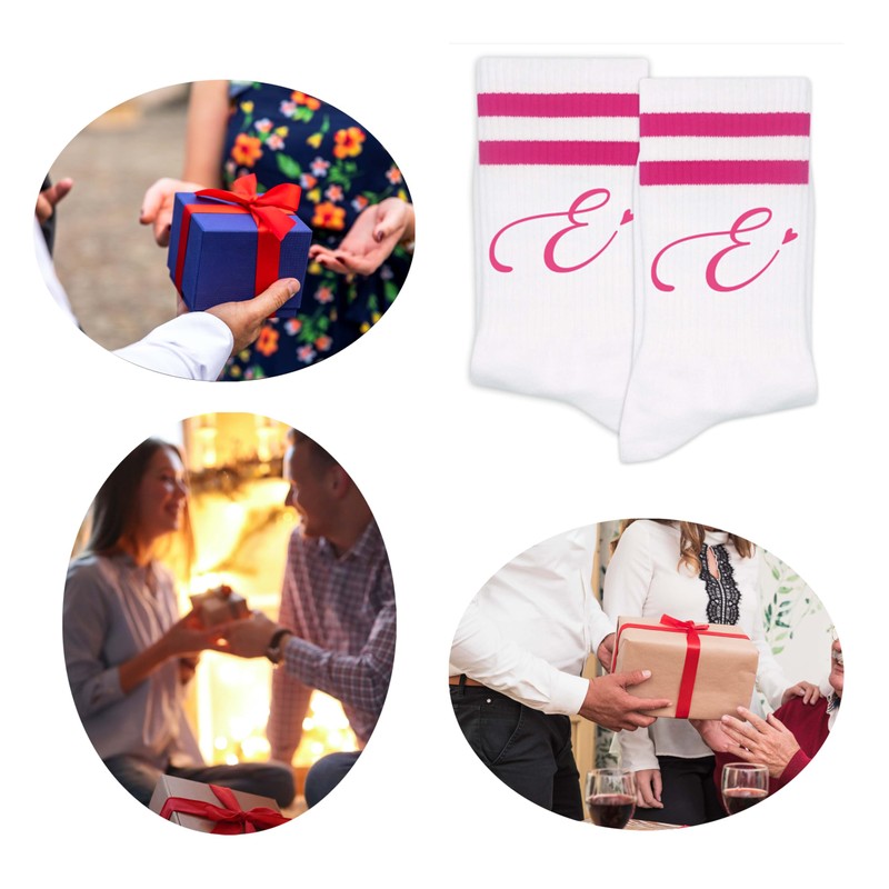 Women’s Socks, White Socks with the Letter ‘E in Hot Pink Color, Birthday Gifts, Back-to-School Season Gifts for Girls, Girlfriend, Classmates, Best Friends, Sisters, Her, Lady, Wife, Mom. (005)