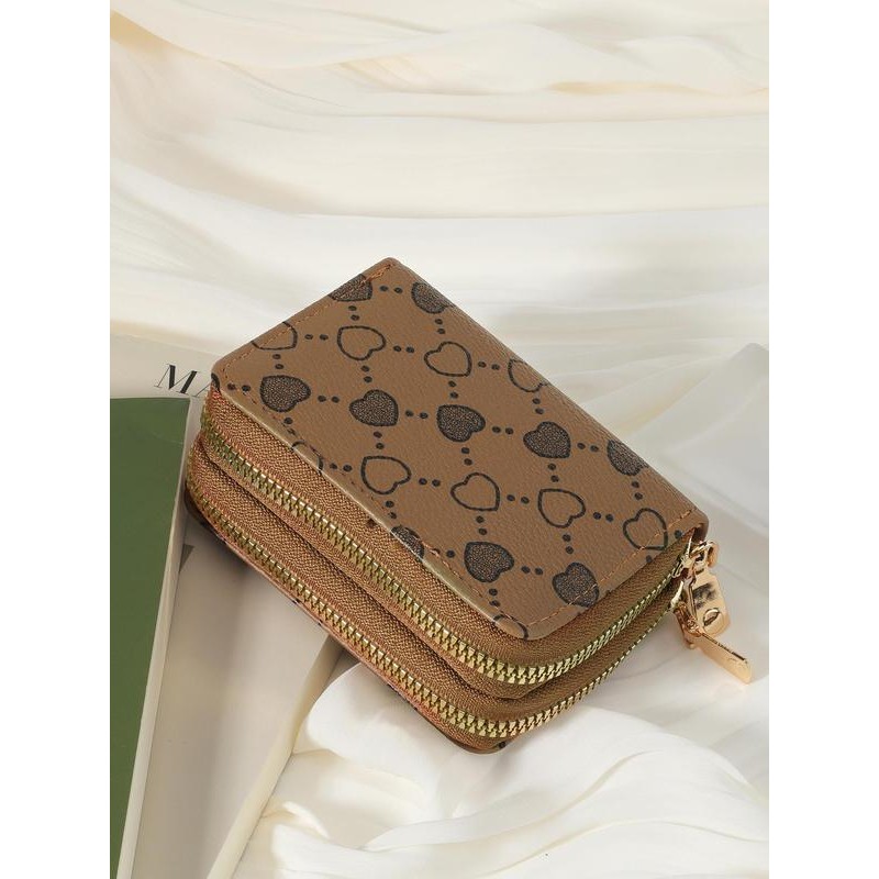 Women's Summer Retro Heart Print Double Zipper Around Coin Purse, Simple Multi-card Card Holder, Pu Leather Credit Card Wallet Storage Bag for Outdoors & Travel, Fall Outfits, Earthtone Fall Freshness:_Pink_Please Refer To The Pictures for Dimensions