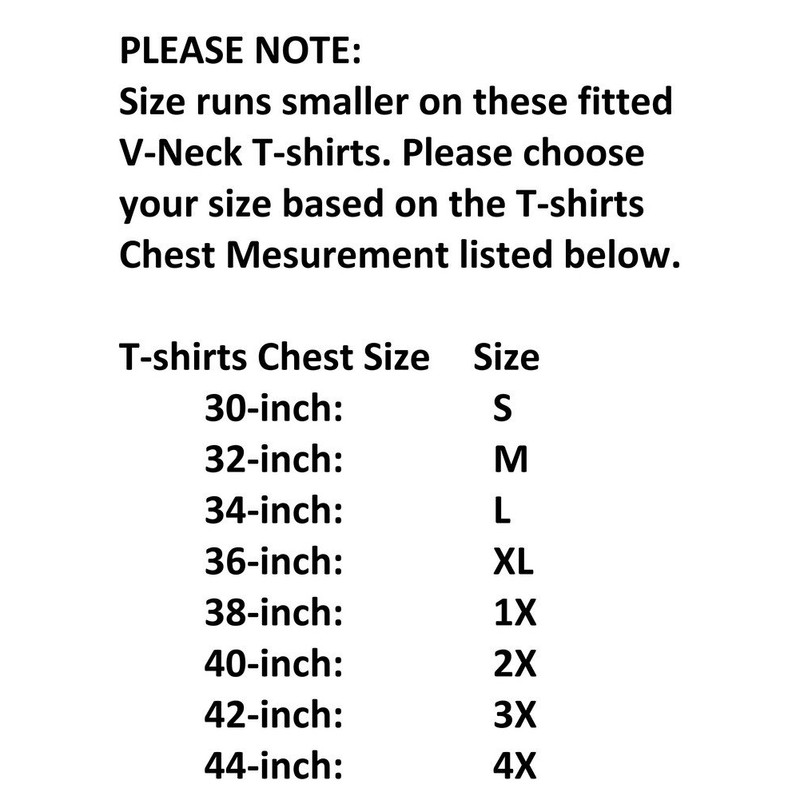 - PLEASE NOTE: Size runs smaller on these fitted V-Neck T-shirts. Please choose your size based on the T-shirts Chest Measurement listed below. It is recommended to add 2 inches or more to your own chest measurement for t-shirts.