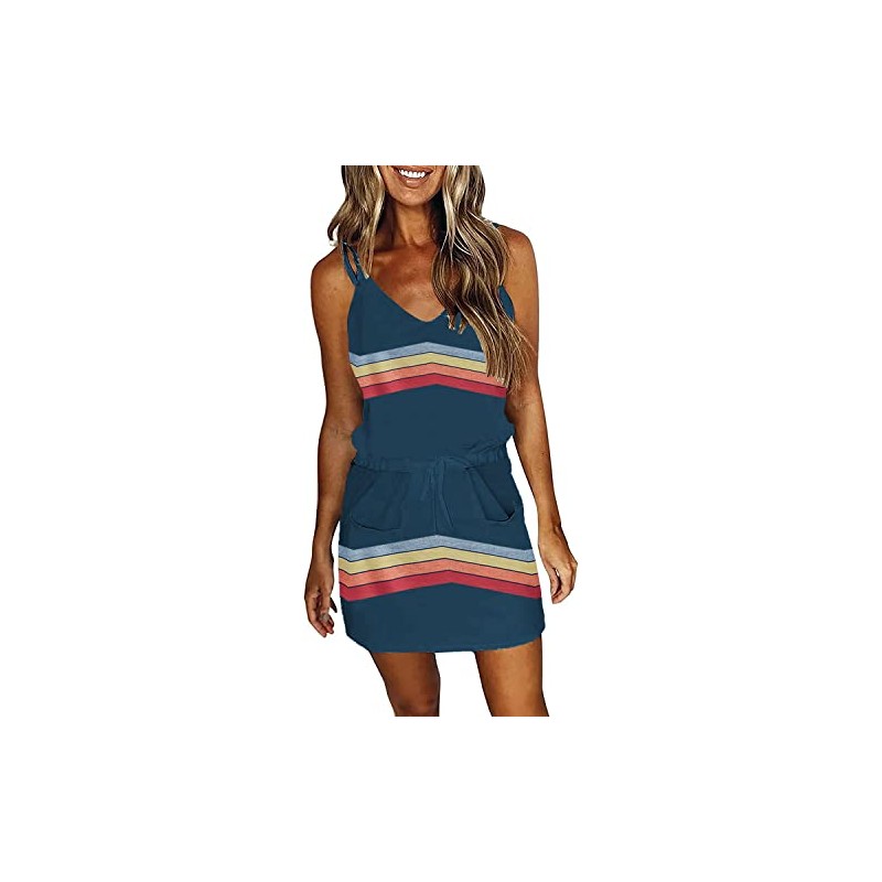 - ❤Sleeveless, Mini length, Loose fit, good as a beach coverups for women.The neckline of this trendy striped sleeveless summer fress is not too low and its not too short,a perfect backyard/house dress.Simple yet stylish colorful patterns, fit for most body shapes, make you look more fashion and trendy, also can be a maternity clothes.It's easy to dress up a bit depending on different accessories.Great touch with two pockets