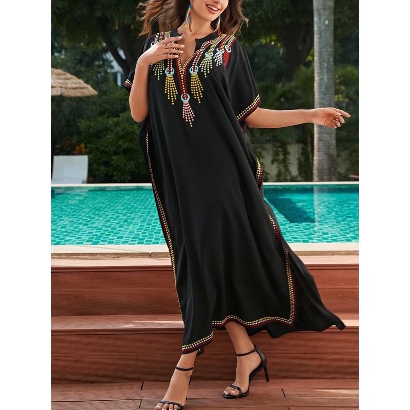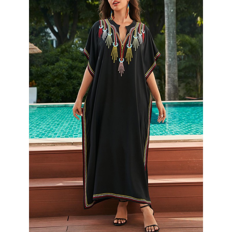 Women Embroidered Kaftan Dress V Neck Long Caftan Bathing Suit Cover Up Split Maxi Dresses