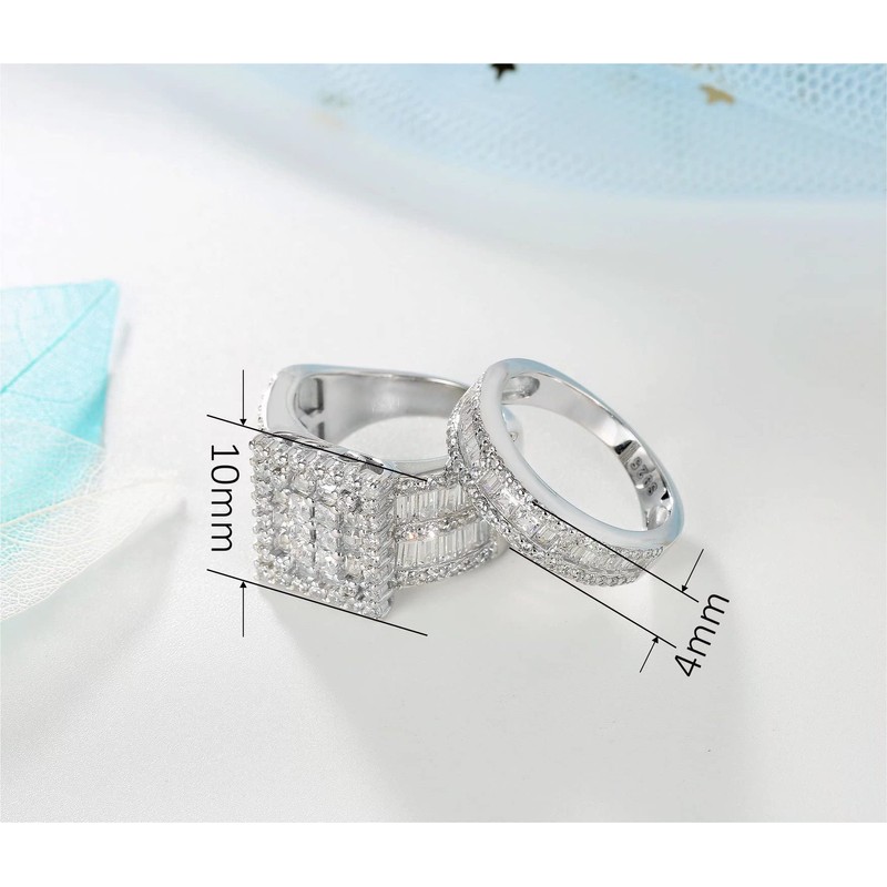 - STYLISH - The wedding ring set includes a 2.85 ct princess-cut halo CZ wedding band and an eternity dainty ring. This ring sets has a classic 4-Prong-Setting craft to prevent the CZ stone fall off, and both sides of the ring features some sparkling petite CZ stone to complement the center cubic zirconia stone.The width of big ring is 10mm, the width of small band is 4mm. The wedding rings set has 12pcs square cubic zirconia, 106pcs round cz, 44pcs bagutte cut cz.