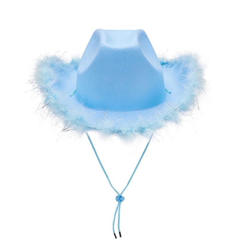 - Design: cowgirl hat, solid color, furry edge and wide brim, fashion and chic. The furry hat is a real eye-catcher. Adjustable neck string hat, very easy to put on and take off.