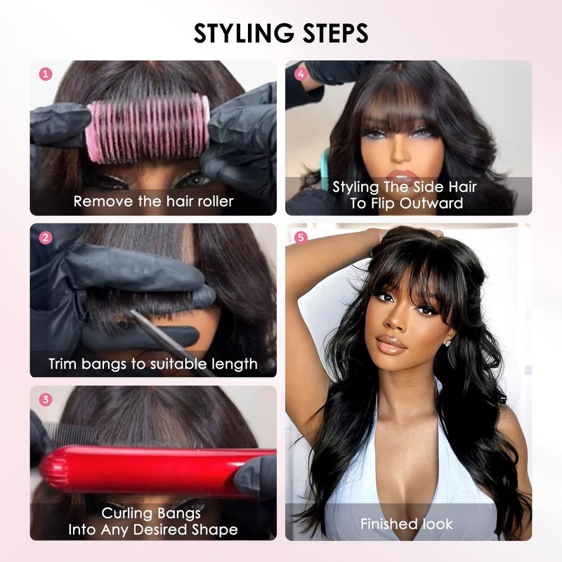 Women Wig Natural Curtain Bangs Loose Wave 6x6cm Glueless Human Hair 200% Density Glue Natural Wig Human Hair Body Wave Lace Front Wig Human Hair 18 Inch