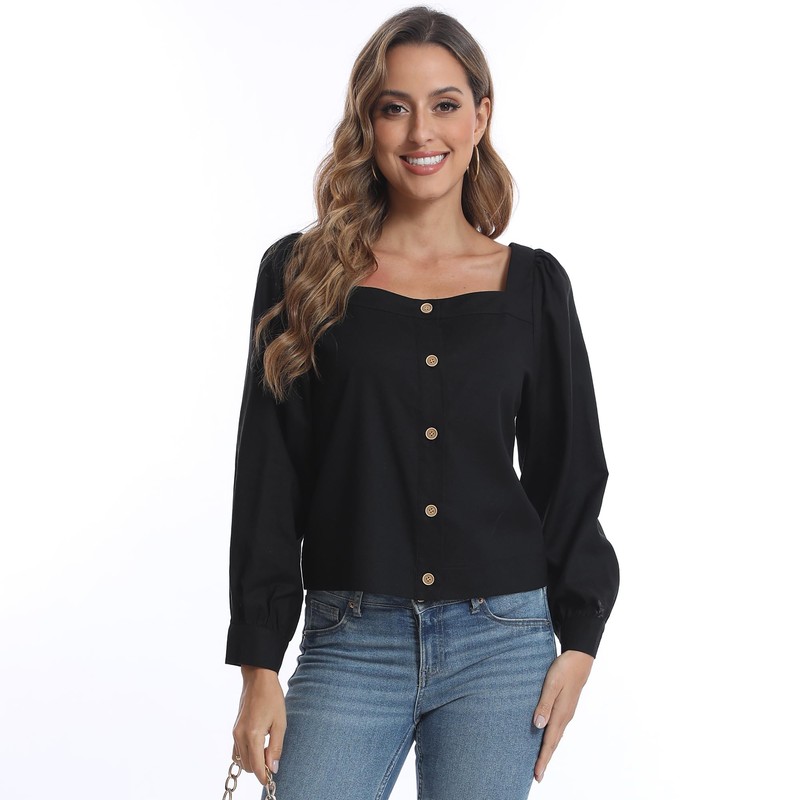 Womens 2024 Black Button Up Top Long Sleeves Shirts Square Neckline Casual Blouse