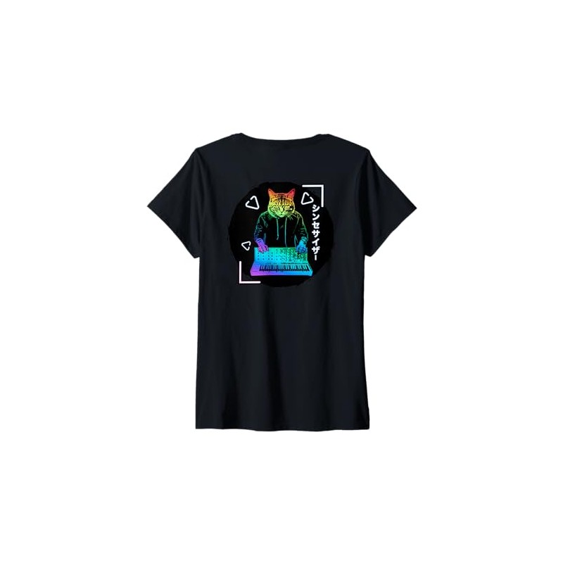 Womens Backprint | Synthpop Music, Cats Synth-Japanese Synthesizer V-Neck T-Shirt
