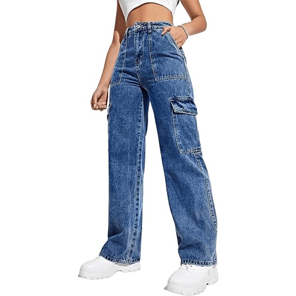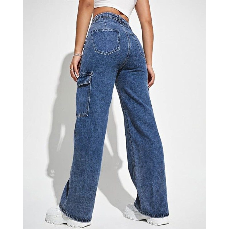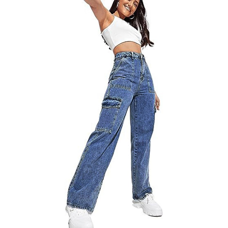 Womens Cargo Denim Pants High Waisted Tummy Control Straight Leg Flap Pocket Jeans