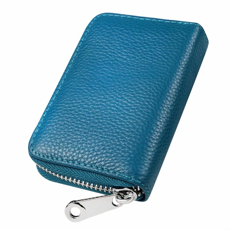 Womens Credit Card Holder Wallet Zip Leather Card Case RFID Blocking Ladies Small Blocked Accordion Wallets with Stainless Steel Zipper Woman Compact Accordian ID Cards Bag Sea Blue