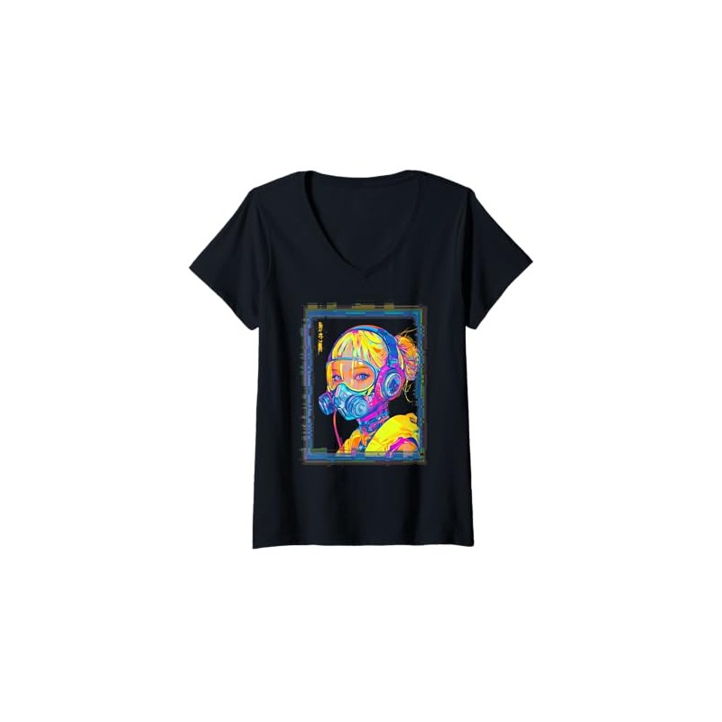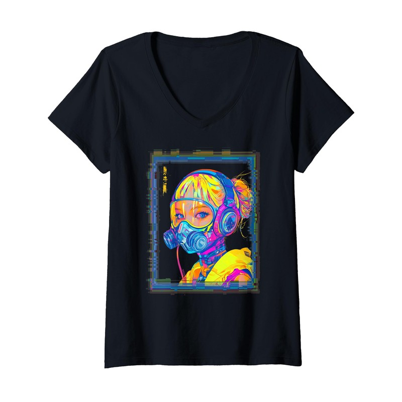Womens Cyberpunk Gas Mask Girl Techwear V-Neck T-Shirt