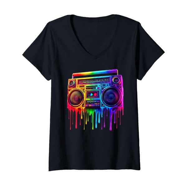 Womens Dripping Paint Boombox Old School 80s Music Hip Hop V-Neck T-Shirt