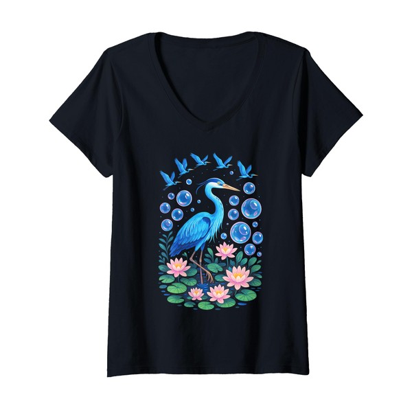 Womens Exotic Heron - Tropical Bird Lotus Pond Art V-Neck T-Shirt