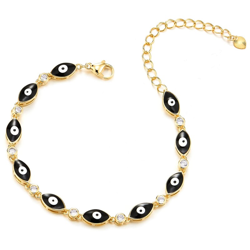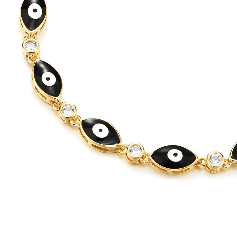 - Womens Gold Color Link Chain Bracelet of Black Evil Eye Charms, with Cubic Zirconia, Adjustable(CA)