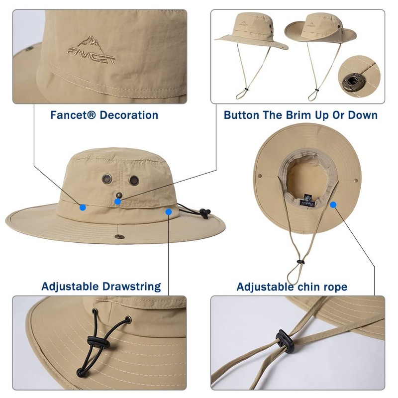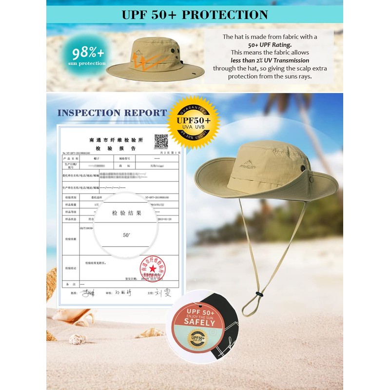 Womens Mens Sun Hat Wide Brim UPF 50+ Ladies Waterproof Safari Hat Bush Boonie Hats for Walking Trekking Fishing Camping Hiking Sailing Folding Adjustable Breathable M 54-57CM Khaki