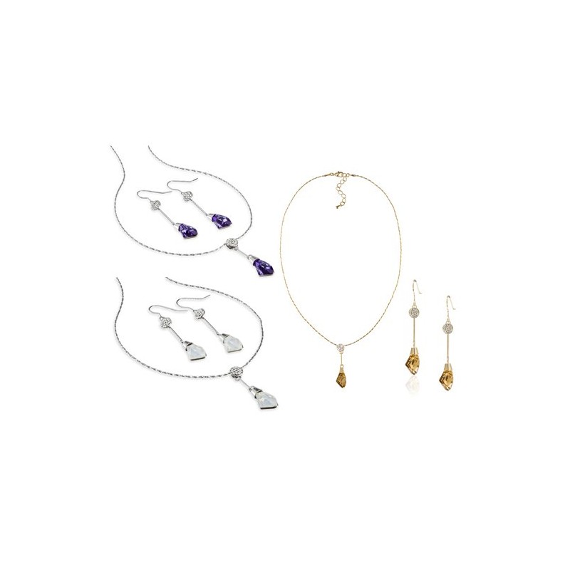 Pure Swarovski Elements Crystals Set, Stunning large Single 'Polygon' Asymmetric crystal 14mm Pendant. The earrings are equally dramatic, same single Swarovski stone. Unique design with Craftsmanship, Contemporary subtle statement jewellery in 14KGold or Rhodium Plating. White Alabaster, Gold Topaz and Tanzanite. It's Exquisite. Great Value set under £35 for all Swarovski! That's janeo!!