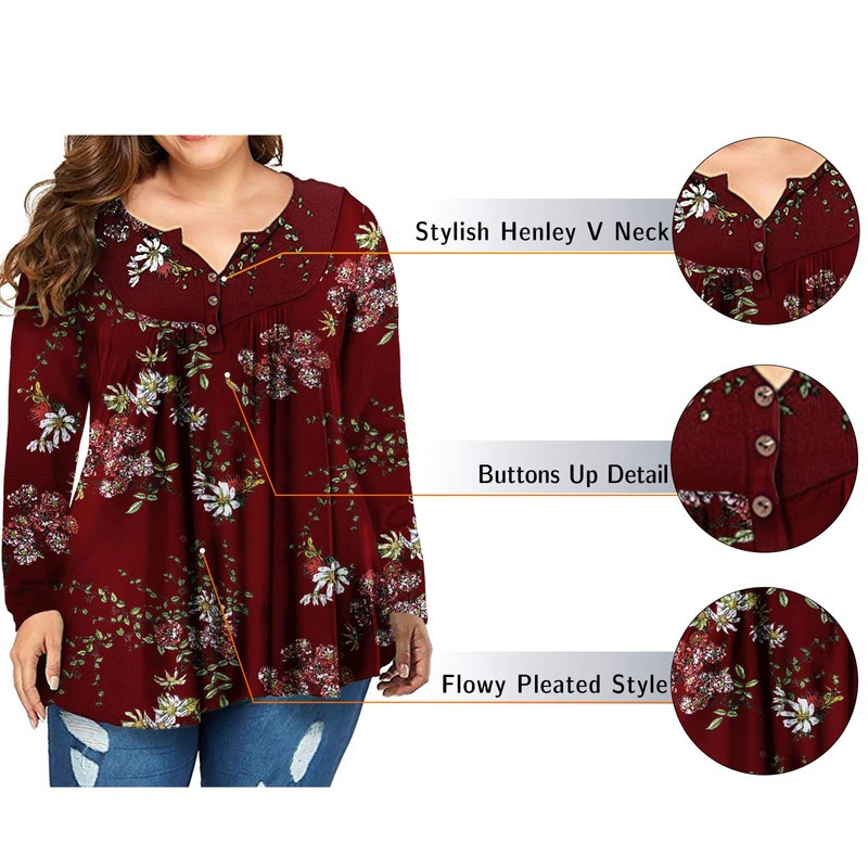Womens Plus Size Henley Shirt Buttons Up T Shirts Casual Loose Floral Print Tunic Tops G 2XL 18W