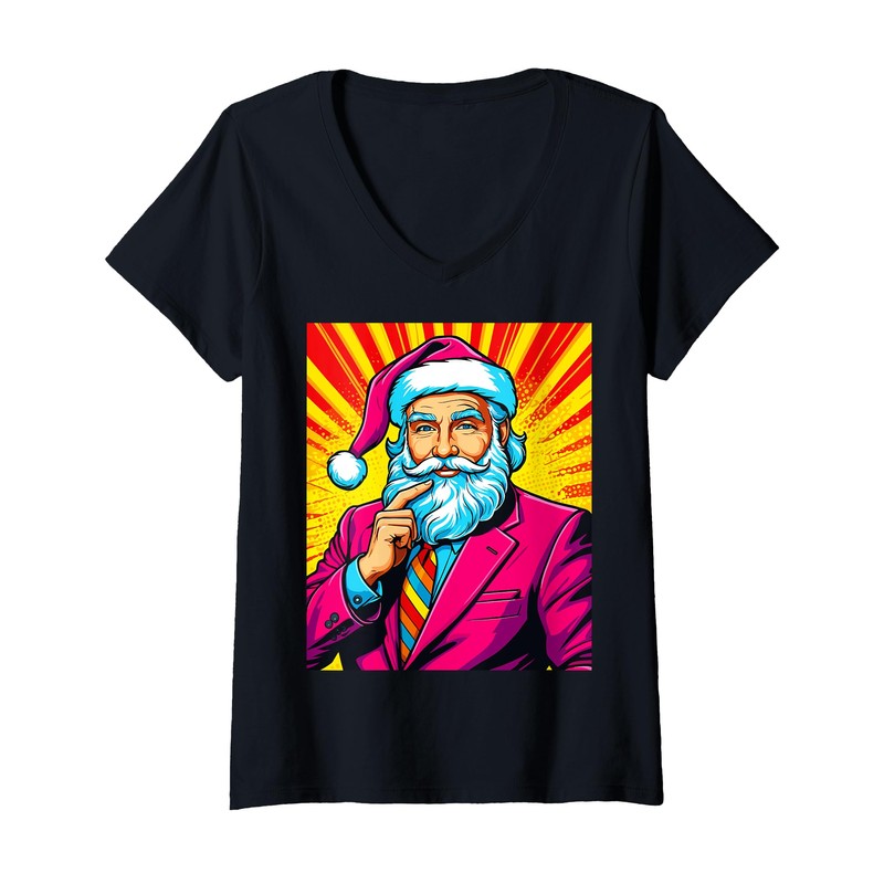Womens Pop Art Santa Claus in Business Suit V-Neck T-Shirt