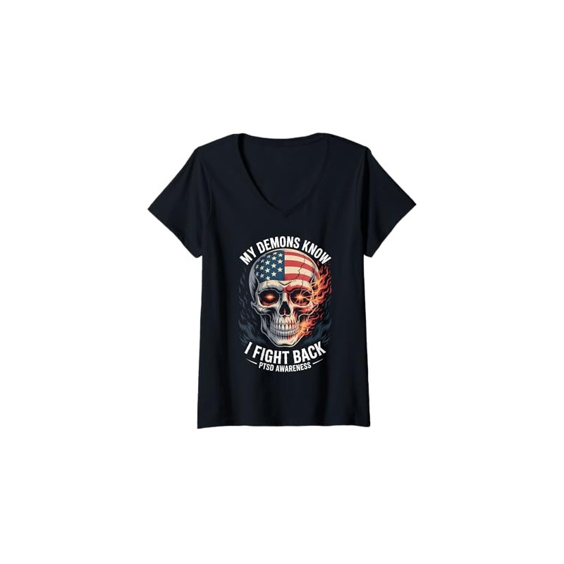 Womens Reaper PTSD My Demons Know I Fight Mental Health Awareness V-Neck T-Shirt