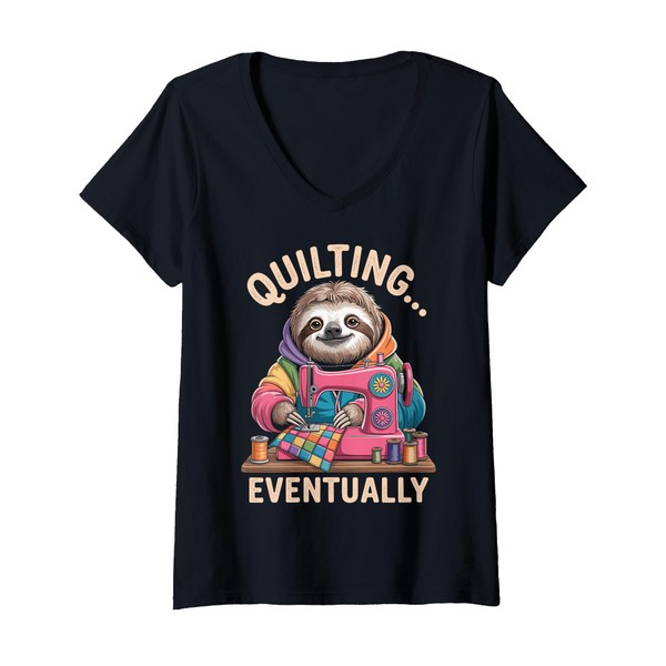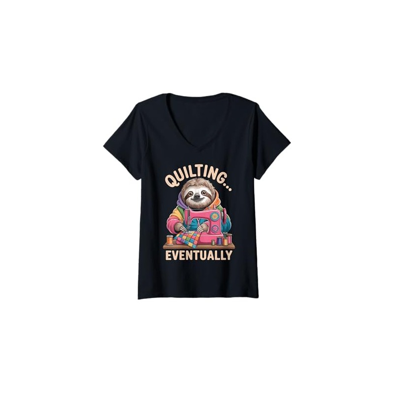 Womens Sloth Quilting Eventually Funny Quilting Quilt V-Neck T-Shirt