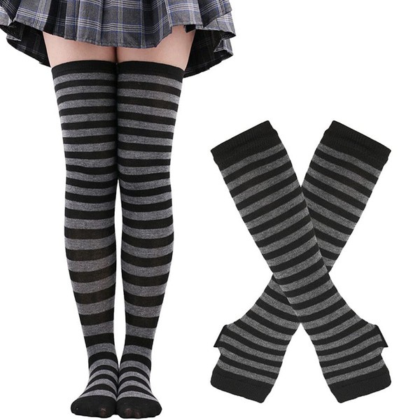 Womens Striped Knee High Socks Leg Arm Warmer Fingerless Gloves Set Party Cosplay Costume Accessories (Black grey stripe)