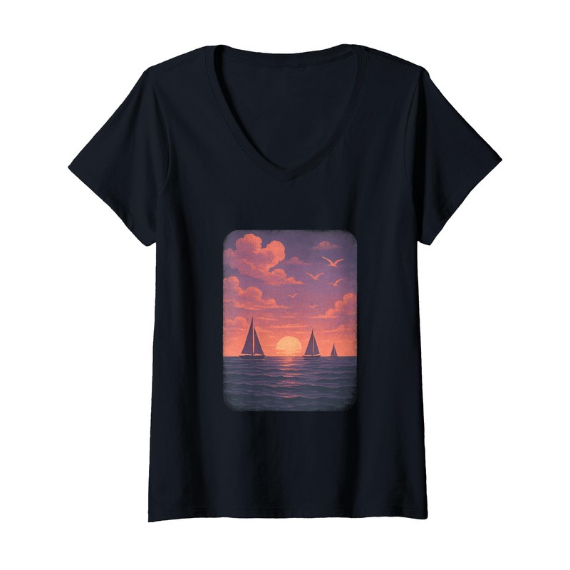 Womens Sunset Sailing - Ocean Adventure Art V-Neck T-Shirt