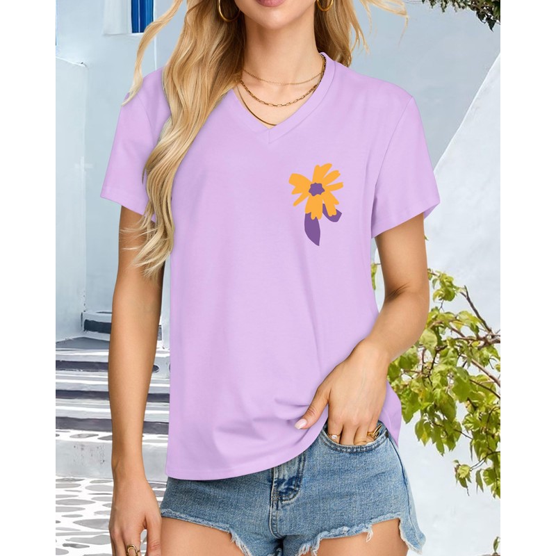 Womens T Shirts V Neck Short Sleeve Summer Tops Casual Basic Tees, Purple Yellow Flower, L