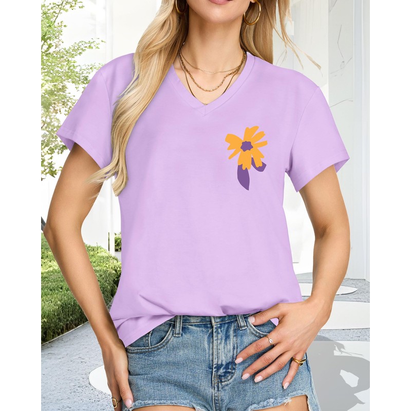 Womens T Shirts V Neck Short Sleeve Summer Tops Casual Basic Tees, Purple Yellow Flower, L
