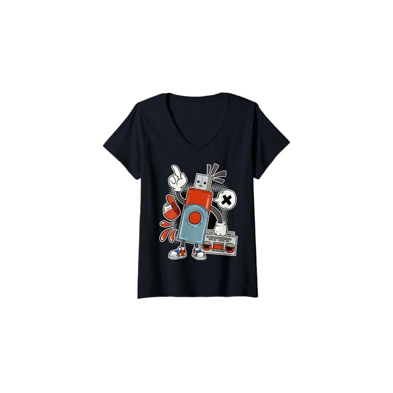 Womens X Retro Robot Character Fun Cartoon Boom Box Flash Drive V-Neck T-Shirt