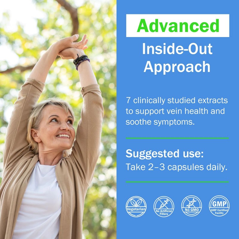- Collagen synthesis support: Vitamin C plus botanicals aid connective tissue structure and elasticity around sensitive veins.