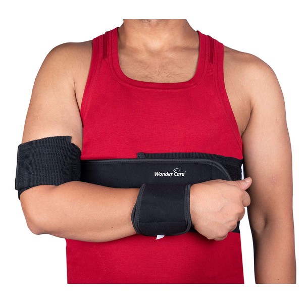 - Adjustable: fits left or right arm. Can be worn by the patient itself as it comes together at the front with a wide Velcro fastener. The patient of both men and women can adjust this shoulder compression bandage arm sling with the help of hook and loop adjustment.