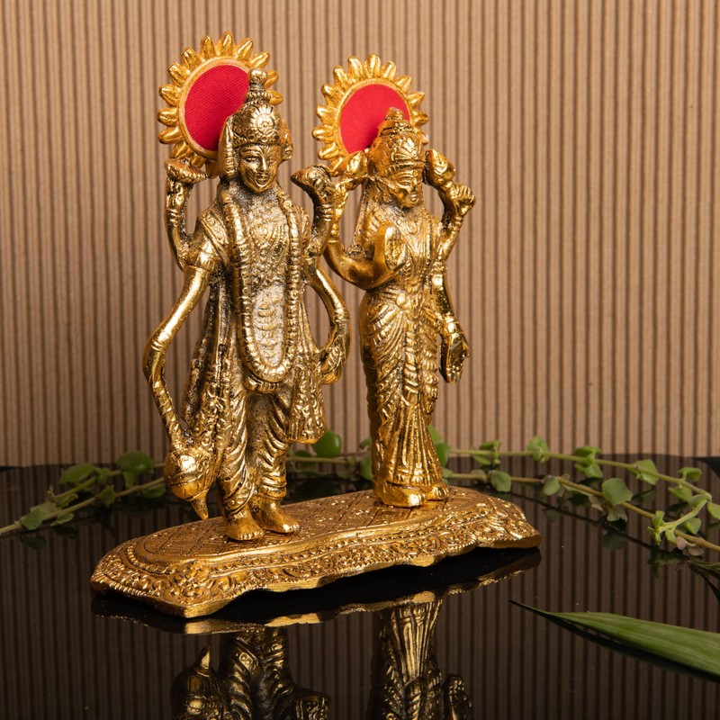 - MATERIAL: This Laxmi Narayan Idol is made of Aluminium with golden color electroplating.Exquisite craftsmanship and fine detailed work gives it a classic look.