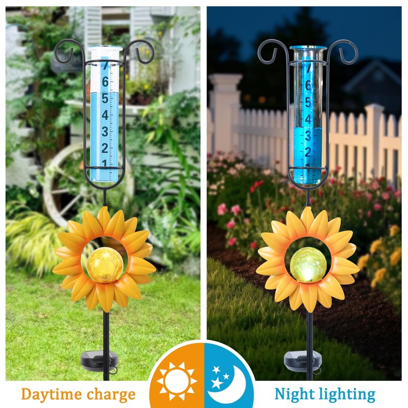 - {Solar Rain Gauge} Unlike the basic functional rain gauges on the market, our rain gauges are both functional and decorative. This sunflower rain gauge with crackled glass ball is equipped with high-efficiency solar panel. Switch on the solar light, it will be charged under the sunlight and illuminating your garden at night, adding enchantment to your outdoor space