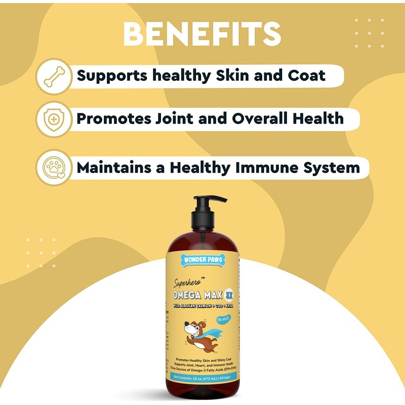 - EFFECTIVE FISH OIL FOR DOGS: Wonder Paws powerful Omega Max 3x liquid supplement for dogs features 3 different sources of omega 3 for dogs sourced from Wild Caught Alaskan Salmon, Cod & Krill Oil. This unique formula high in Omega 3s, EPA+DHA Fatty Acids will help support your dog's joint, heart, immune system, skin, coat and overall health. Make your pet feel good with Wonder Paws Omega Max 3x!