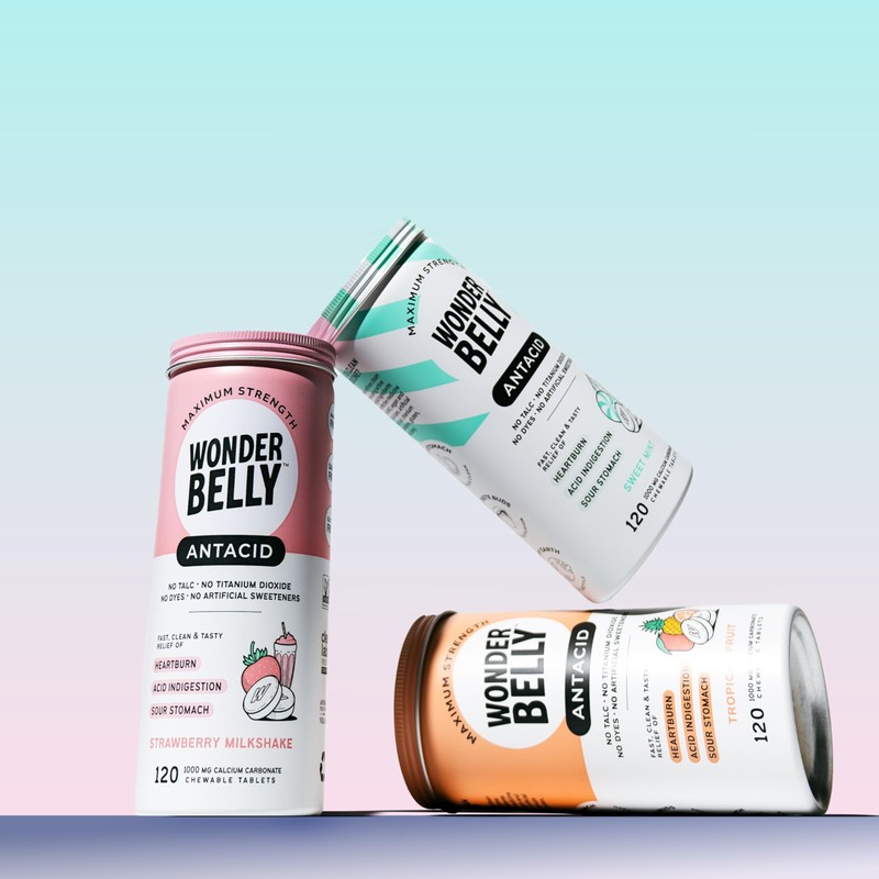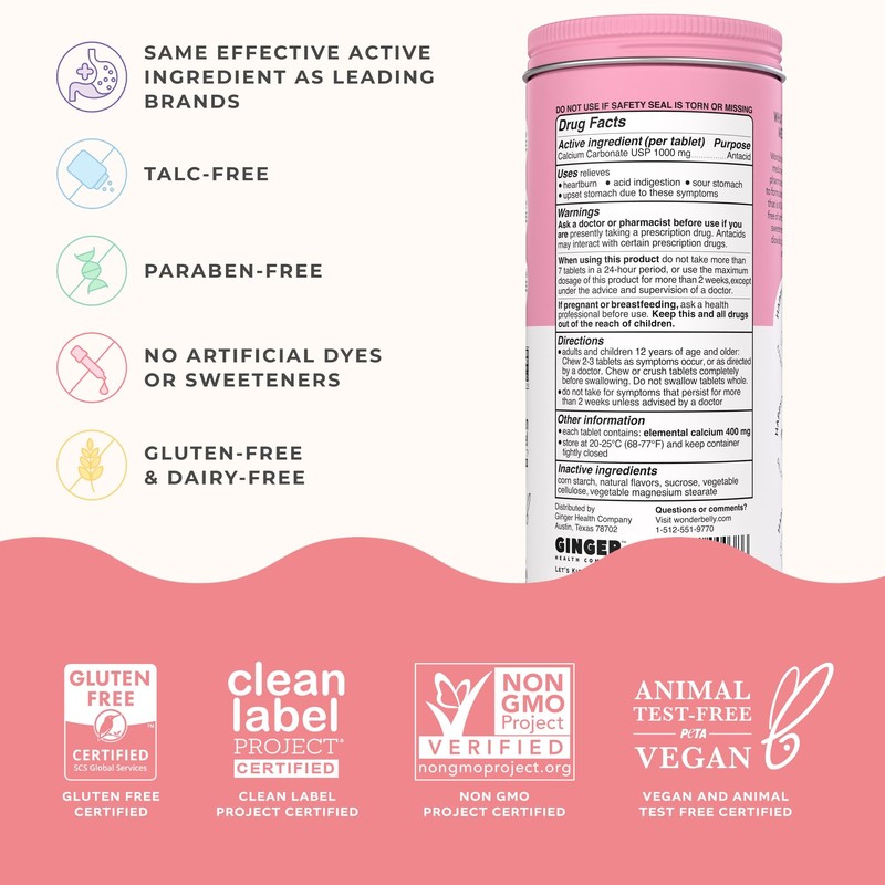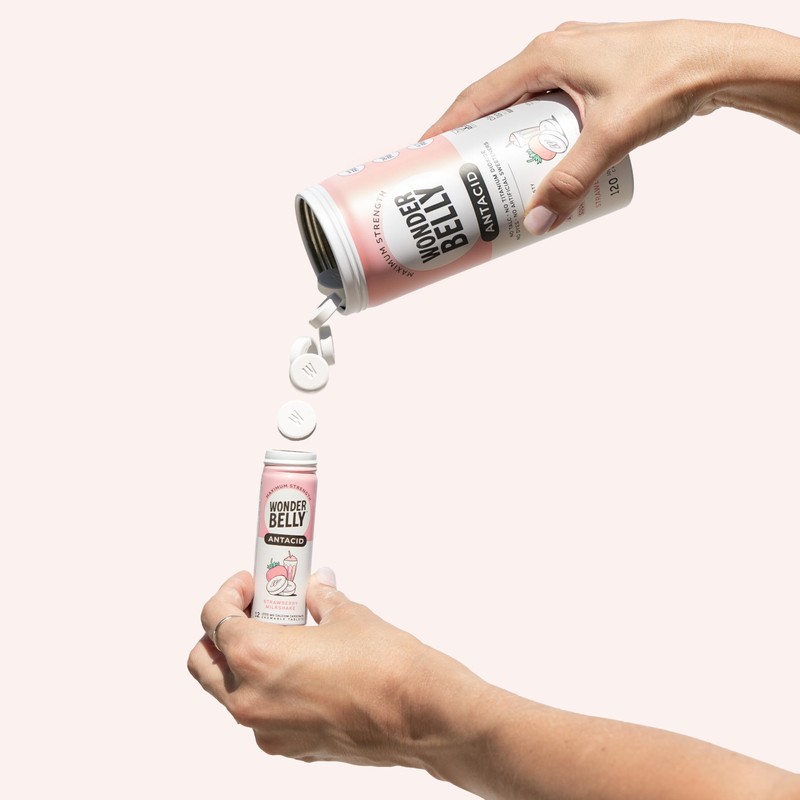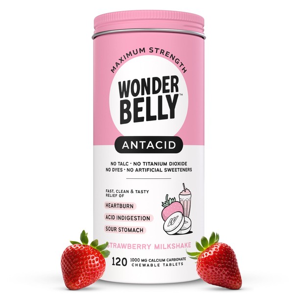 Wonderbelly Antacid, Effective Heartburn and Instant Acid Indigestion Relief, Extra Strength Chewable Tablets, 1000 mg Calcium Carbonate, No Talc or Dye, Strawberry Milkshake, 120 Count