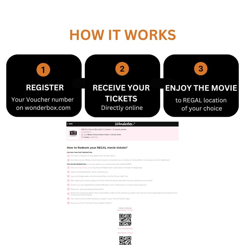 - THE GIFT BOX OFFERS 2 premiere movie tickets + 2 drinks + 2 candies to redeem the movie experience. Access to all movies and AMC locations. The ticket allows for one movie in all the REGAL locations across the US.
