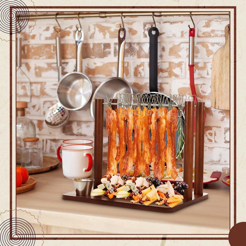 - Convenient, Reusable Clips: the wooden bacon display features 8 quality metal clips, designed to hang meat securely; This innovative feature ensures easy and hygienic food handling; Furthermore, these clips are hand washable and reusable, promoting resource sustainability