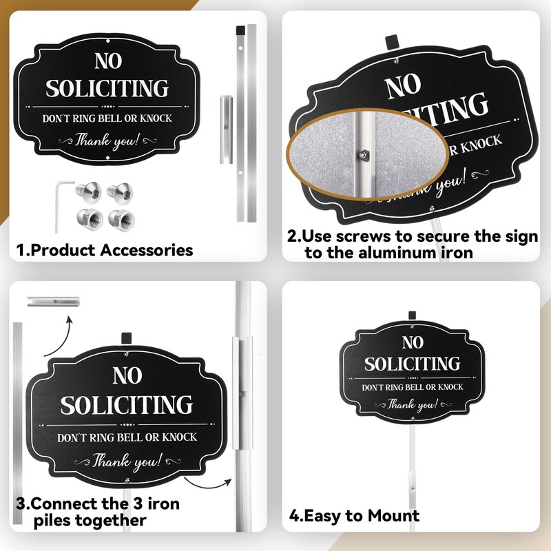 - Easy Installation: the no soliciting metal yard sign package is pre punched and equipped with the accessories and tools required for installation; You only need to connect the stakes and fix the panel with screws on it to complete the assembly; Then insert the no soliciting yard sign for house where you need them; Flower pots, grass, doorways, both sides of fences, and other places
