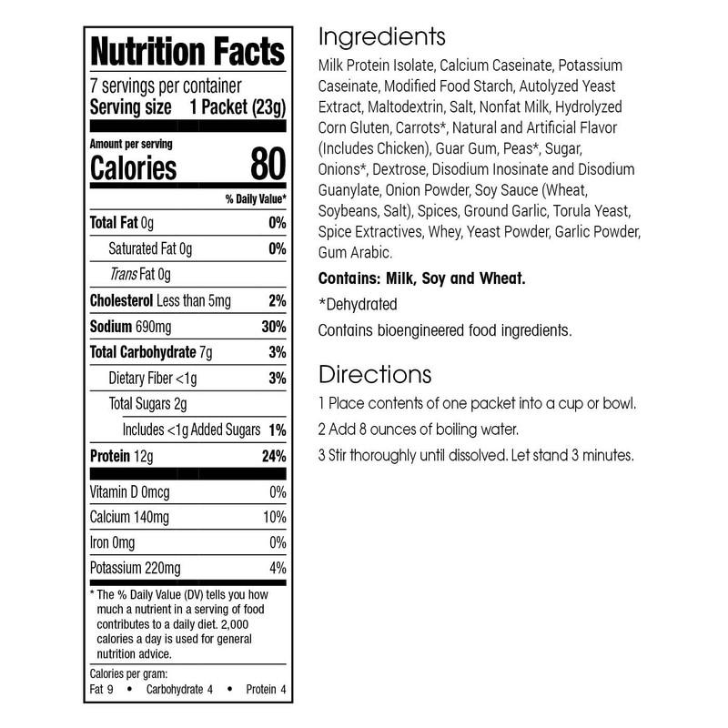 - 80 CALORIES, 12g PROTEIN: Every dried soup packet contains 12-15g of protein and just 70 calories, for a satisfying, light lunch.