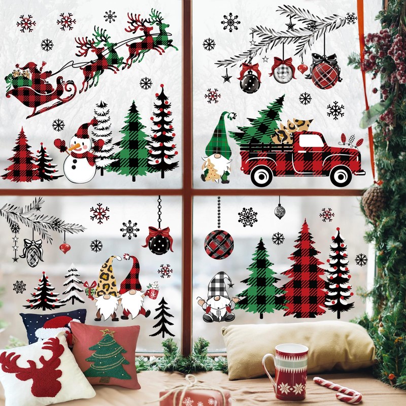 wondever Black Red Xmas Tree Christmas Window Clings Double Sided Plaid Truck Gnome Pine Tree Christmas Window Stickers Anti Collision Static Window Decals for Glass Christmas Window Decorations