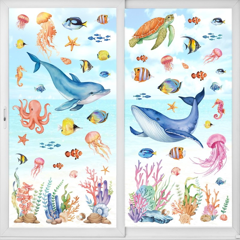 wondever Ocean Theme Animal Window Stickers Under The Sea Whale Fish Turtle Window Decals Anti Collision Double-Side Static Window Clings for Glass Windows Home